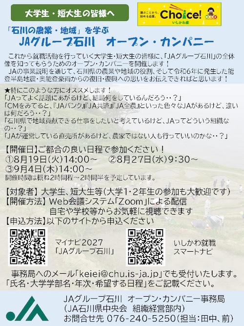 JAグループ石川では、大学生・短大生等の学生の皆様を対象として、石川県のJAグループの役割と事業を広く知っていただくことを目的に、8・9月に「JAグループ石川 オープン・カンパニー」を開催します。