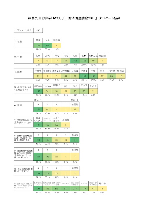 8月9日に開催した林修先生と学ぶ「今でしょ!国消国産講座2025」では、437名の方からアンケートのご協力をいただきました。本アンケートは、講座の満足度や理解度、さらに「国消国産」に対する関心を把握するために実施したものです。