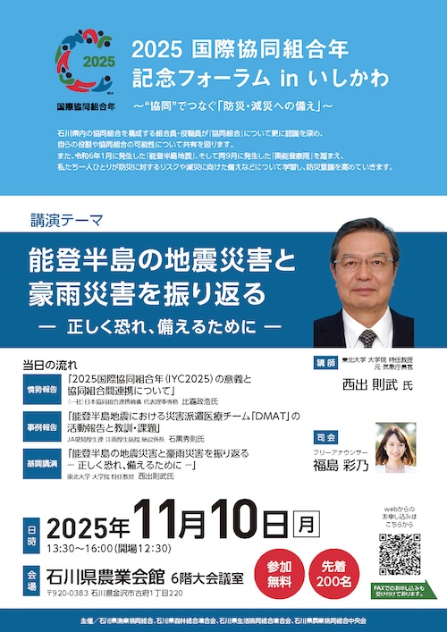 11月10日(月)、石川県農業会館において東北大学大学院特任教授の西出則武氏(元 気象庁長官)らをお招きし、『2025国際協同組合年記念フォーラムinいしかわ』を開催します。