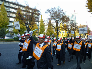 また、集会終了後は、首相官邸や国会議事堂前、議員会館などの周辺でデモ行進を行いました。参加者たちは、「重要5品目断固死守!」と大きな声を張り上げました。