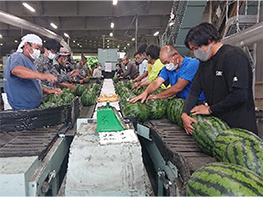 - 栽培方法や定植時期等を組み合わせることで作型を9つに細分化し、全生産者に作付け割合を遵守するよう求め、6月上旬から7月下旬まで切れ目のない出荷を行っている。また、品質管理を徹底し、試し切りや選果場での2段階検査により、高品質な大玉すいかを出荷している。さらに、出荷日予測棒を活用し、高精度な計画出荷を実現することで量販店からの信頼も獲得している。