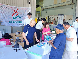 6月28~29日 能登北部JA農機センター展示会において、義援金で購入した首周りを冷気で包み暑さをしのぐネッククーラー(200個)のほか、軍手やボールペンを配布