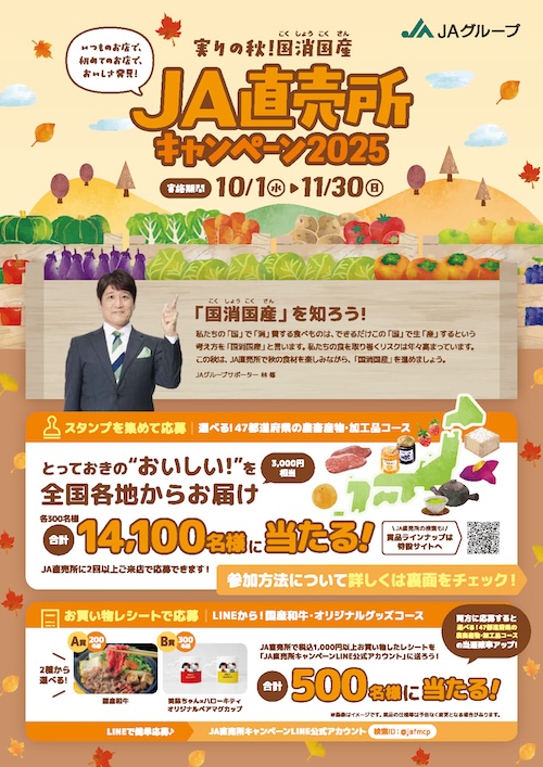 JAグループでは、消費者に国産農畜産物を選んで購入していただき、国消国産を進めていくことや地域農業へのファンづくり、JAグループへの理解促進をはかることを目的に、47都道府県のおいしい農畜産物が当たるJA直売所を基点とした全国キャンペーンを実施します。お近くのJA直売所もしくはAコープ店舗に訪れ、奮ってご応募ください。