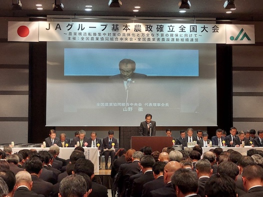 11月10日(月)、JA全中主催の「JAグループ基本農政確立全国大会」が都内のベルサール半蔵門で開催され、全国から集まった生産者やJA組合長ら約800名のほか、オンライン参加を含めて約4,000名が参加・視聴しました。本県からは中央会・各連合会の代表7名が実参加したほか、各JAでオンライン視聴されました。全国大会では、JA全中:山野会長からの代表要請の後、自民党の政策責任者との意見交換会を行い、参加したJA組合長等から「農業構造転換集中対策における農業関連予算の抜本的な拡大」や「共同利用施設の老朽化が進む中、施設の再編にかかる費用の産地負担の軽減」を求める意見など、現場の声を強く訴えました。